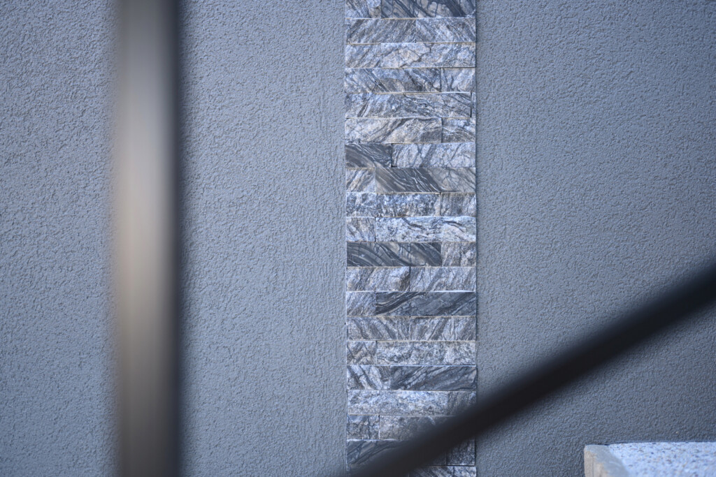 グランドアートウォールは隣地境界に配置し、ジョリパッド仕上げとカルチャーストーンのライン貼りを組み合わせました。