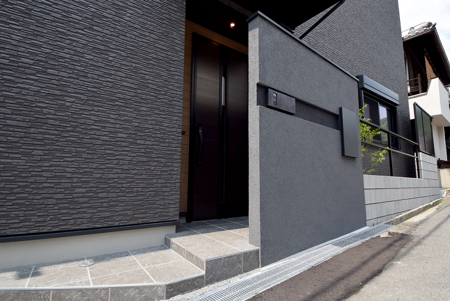 スタイリッシュな印象を与えるとともに、玄関前の目隠しとしてプライバシー性を確保しています。