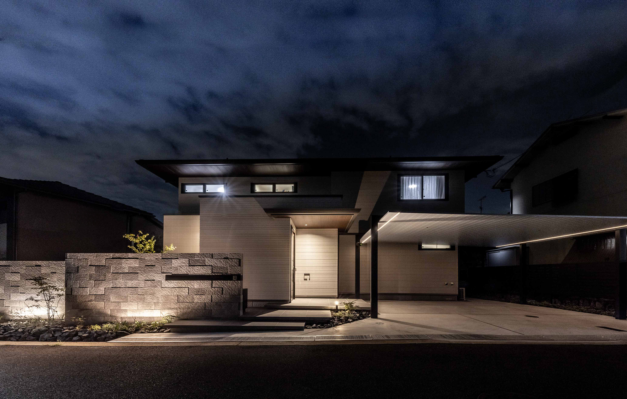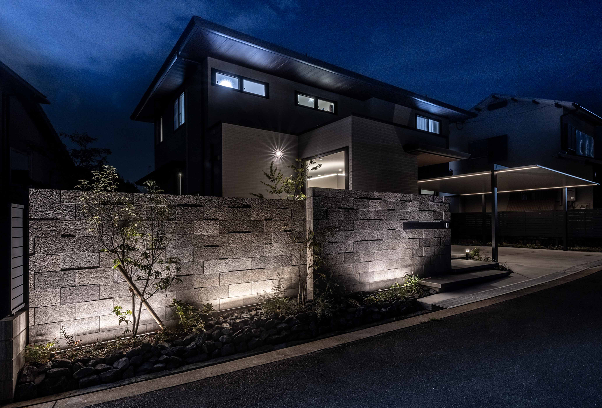LIXIL「カーポートSC」と重厚感あるグランドアートウォールで構成した、昼夜で異なる表情を見せるエクステリアです。