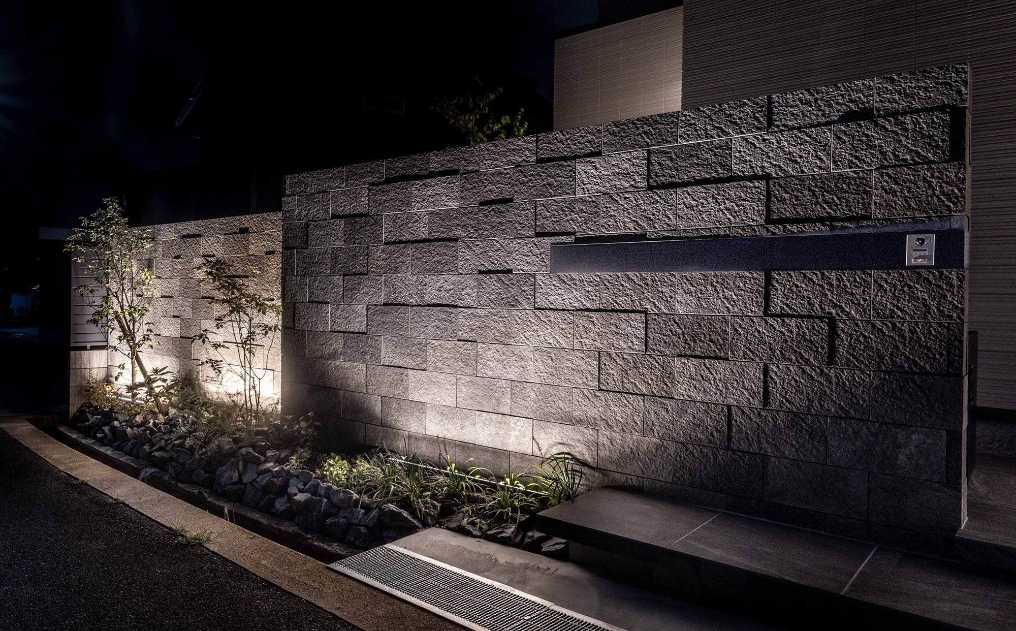 さらに、門塀の足元にはLIXIL「ローポールライト」を設置し、タイルの凹凸や植栽を美しく照らし出しました。