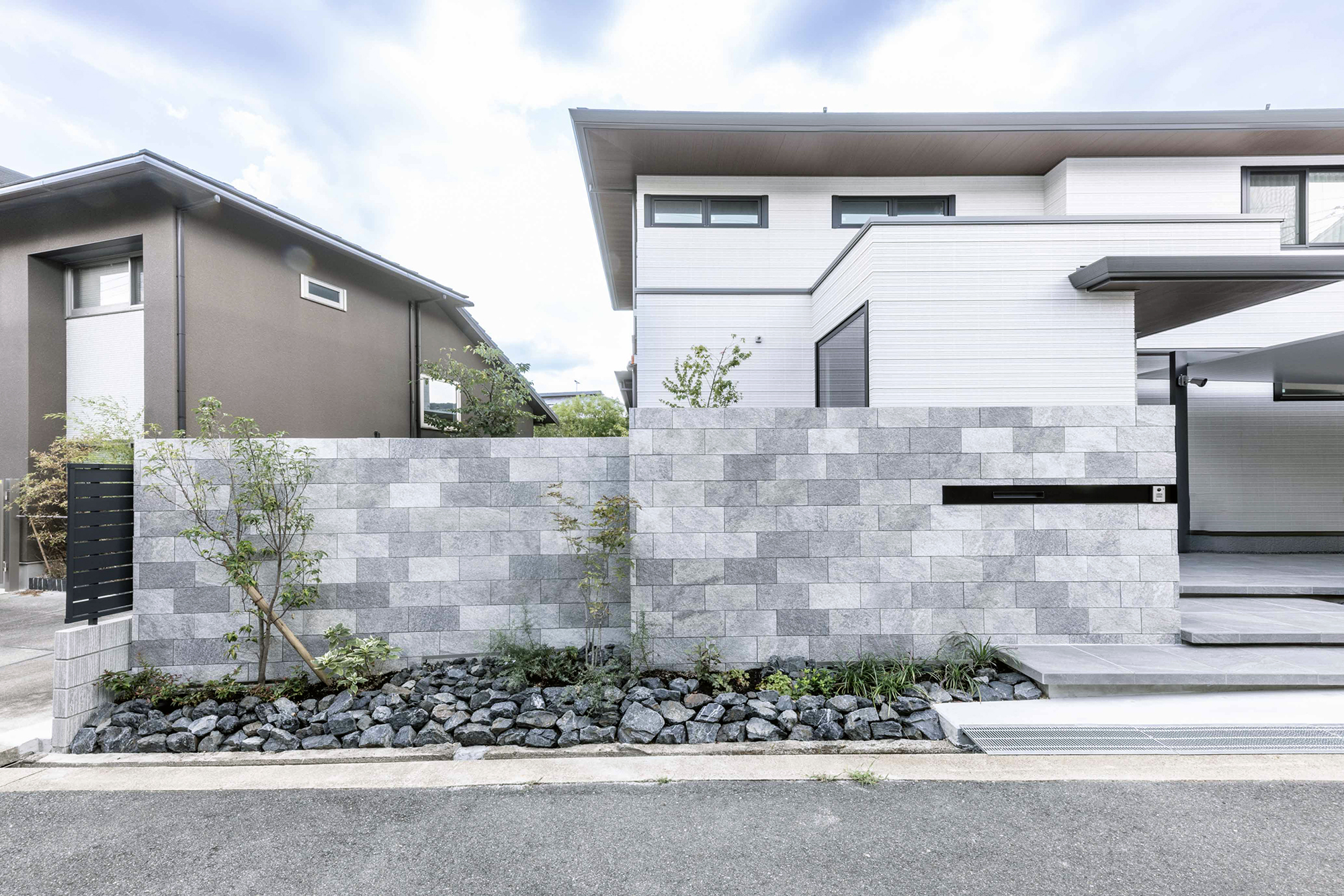 道路側には植栽スペースを設け、足元には濃いグレーの割栗石を敷き詰めることで、モノトーンを基調としながらも自然味を感じる景観を演出。