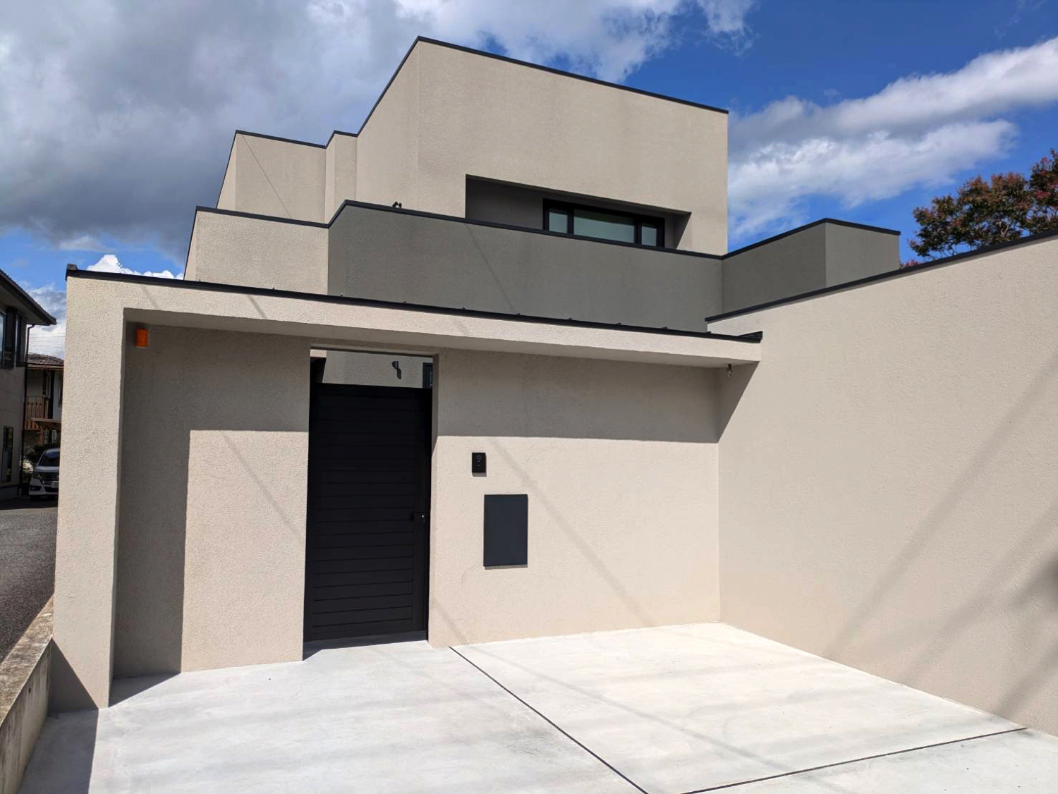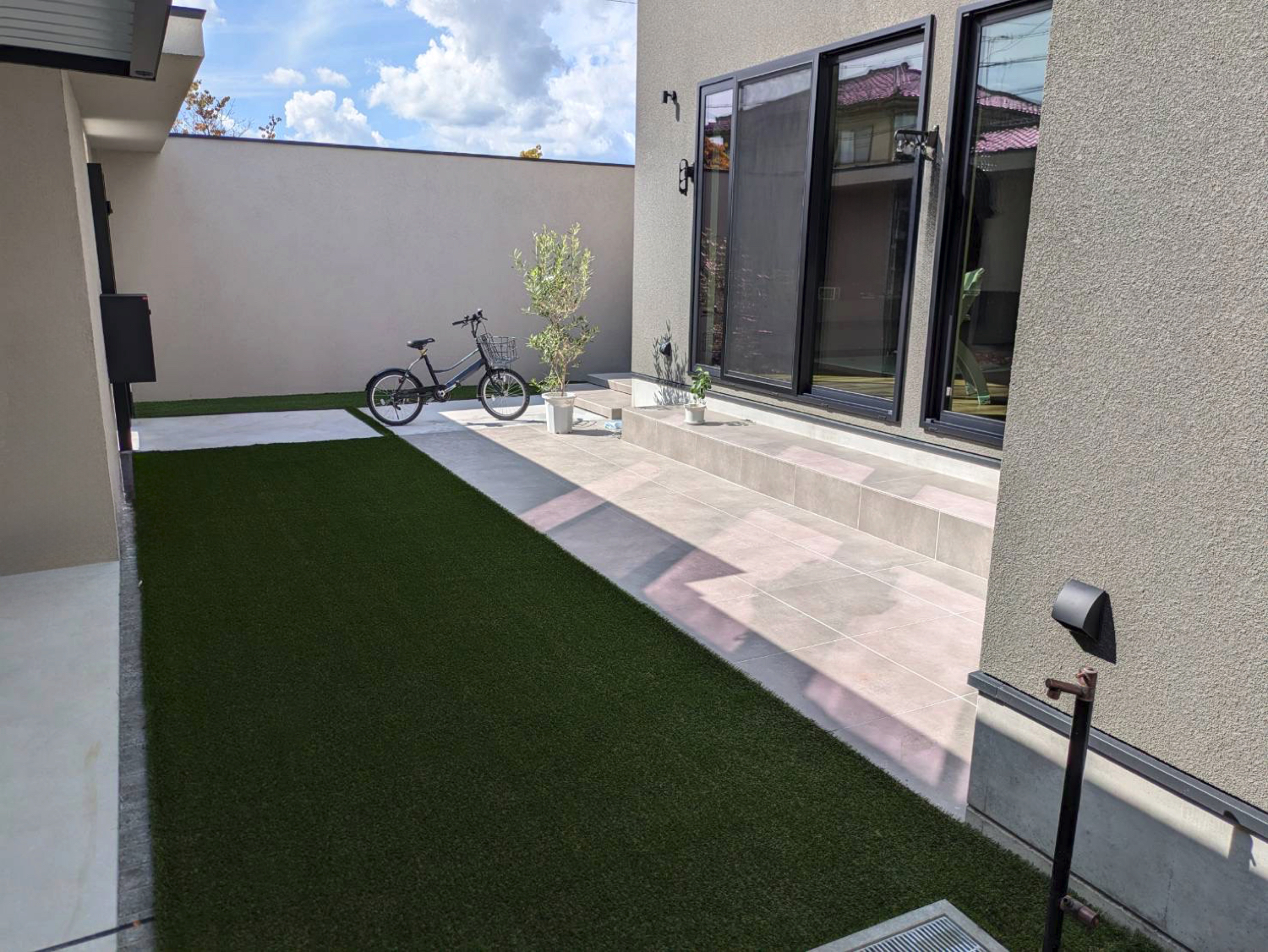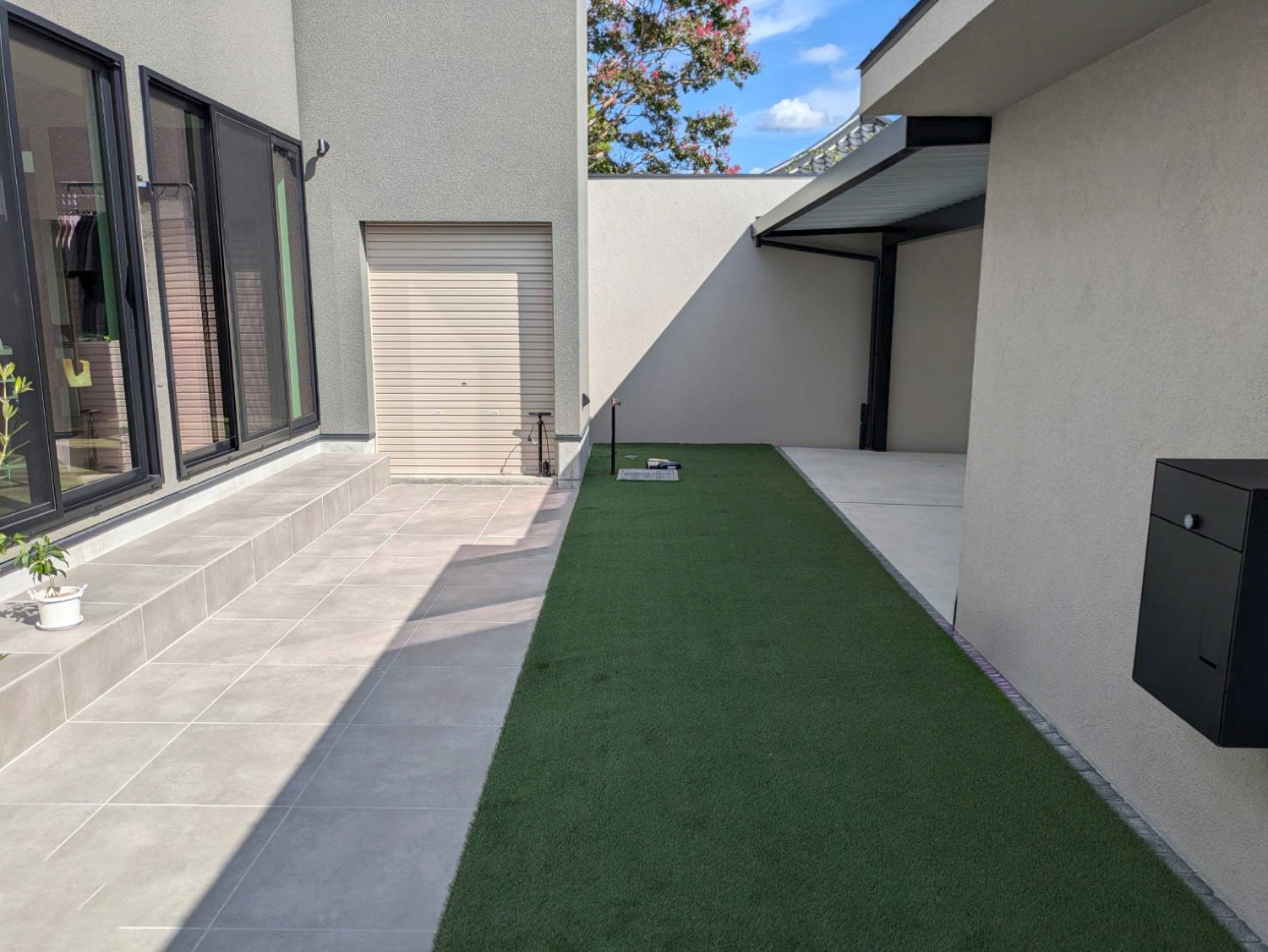 周囲からの視線を気にせず快適に過ごせるよう、高さ2.5~2.7mのグランドアートウォールと、幅5.7m・高さ2.5mのシャッターゲートを施工しました。