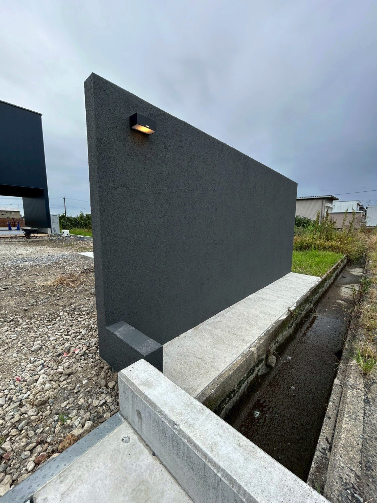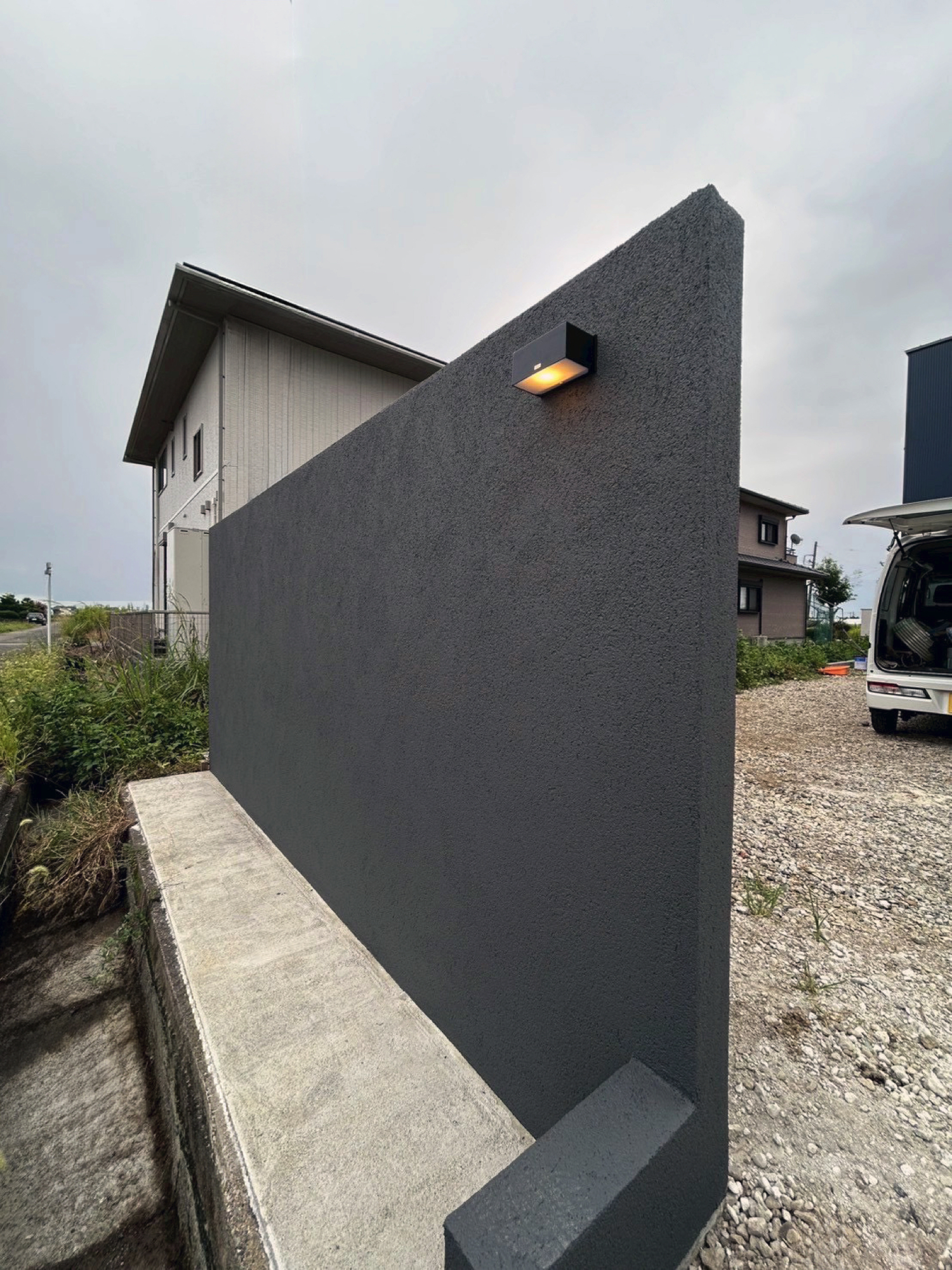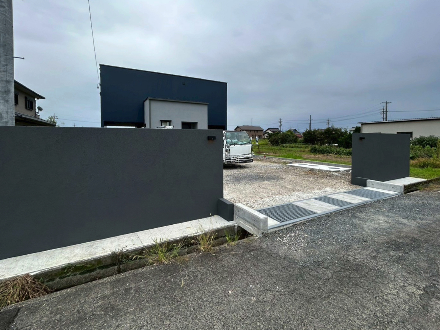 高さ1.6mのグランドアートウォールを採用し、門柱と目隠し塀を一体的に計画しました。