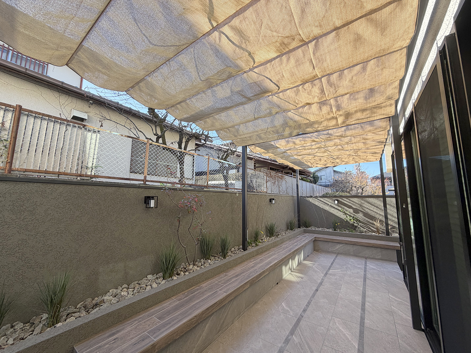 さらに上部にはシェードを設置し、日差しをやわらげながら快適な時間を過ごせる空間に仕上げました。