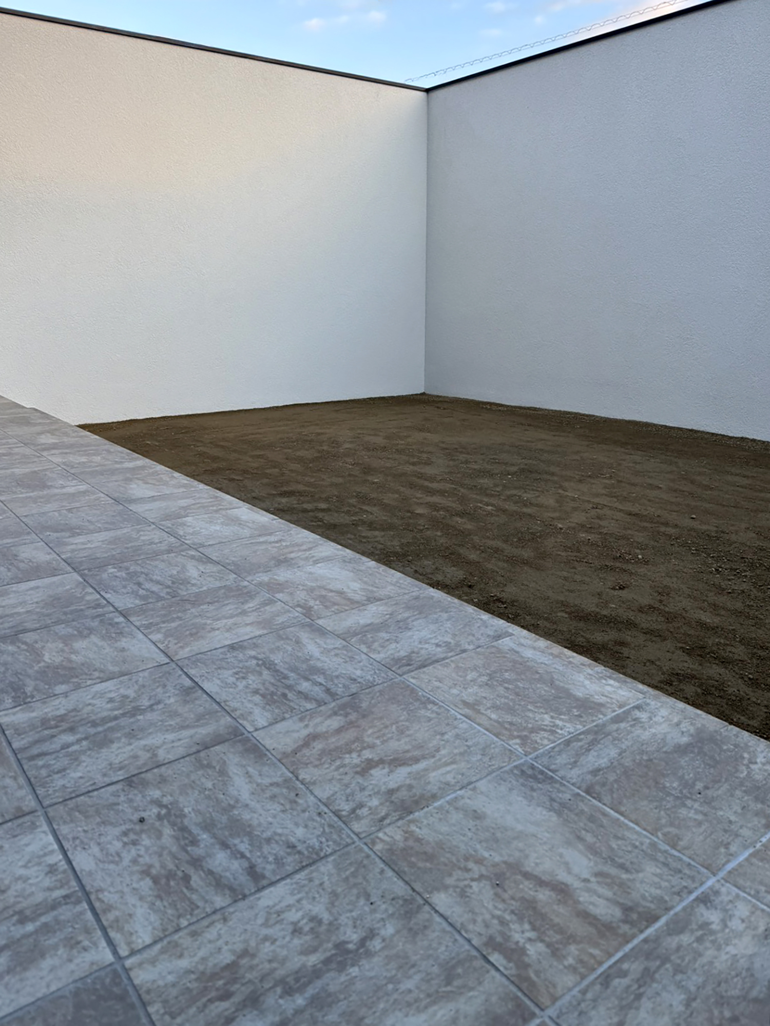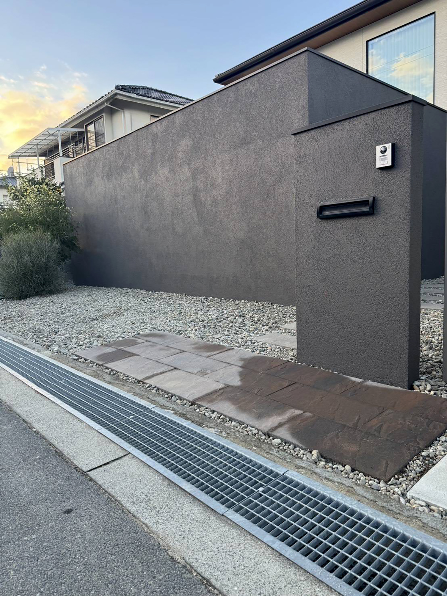シンプルで美しい壁面が住まい全体の印象を引き締め、プライバシーとデザイン性を両立した外構が完成しました。