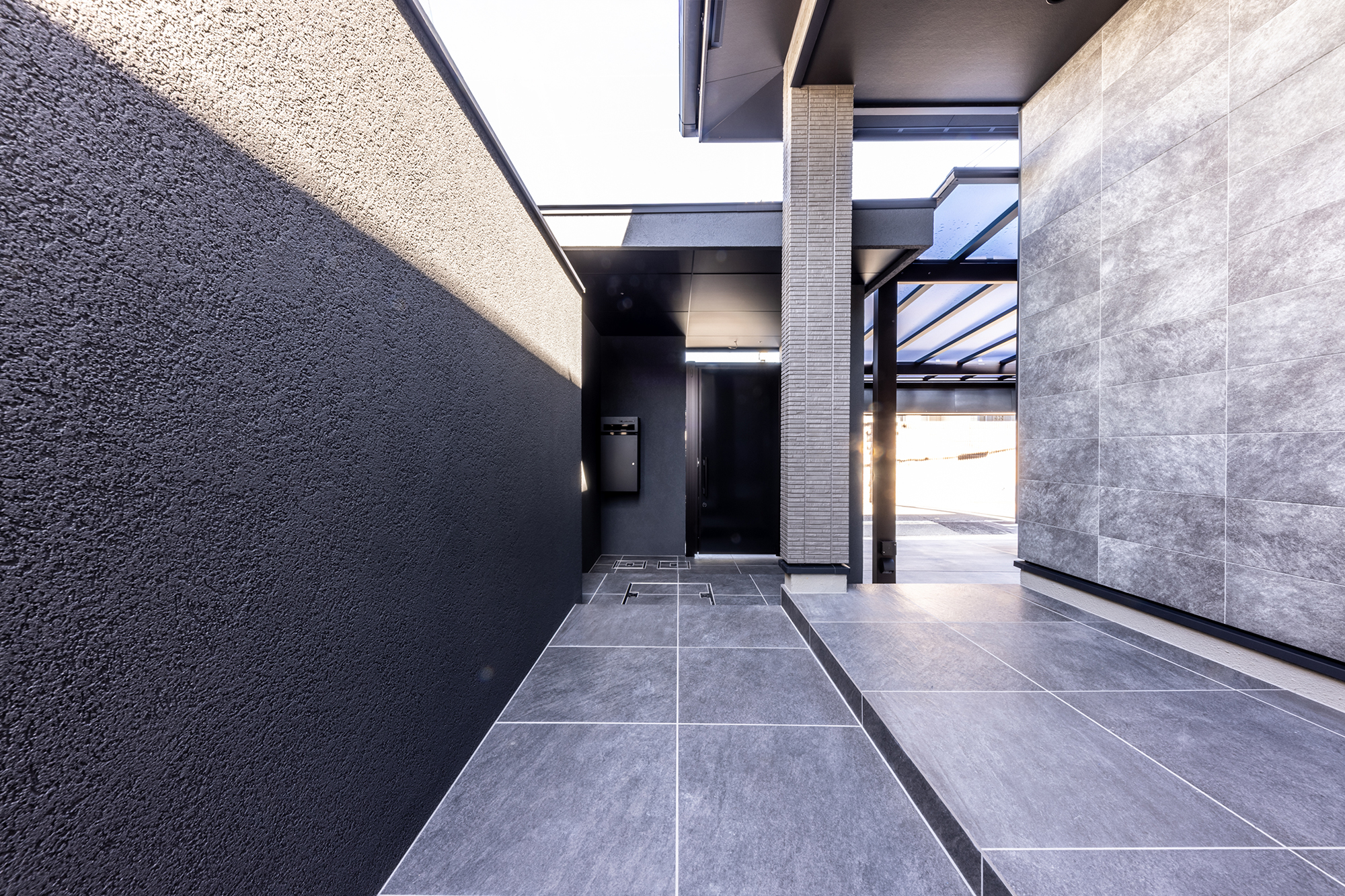 タイル仕上げのゲートとブラックの御前様シャッターでデザイン性と防犯性を高めた重厚感あるファサードに。