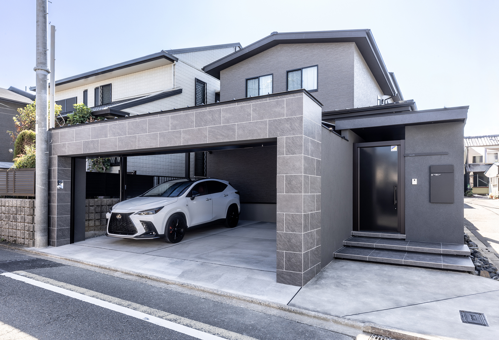 タイル仕上げのゲートとブラックの御前様シャッターでデザイン性と防犯性を高めた重厚感あるファサードに。