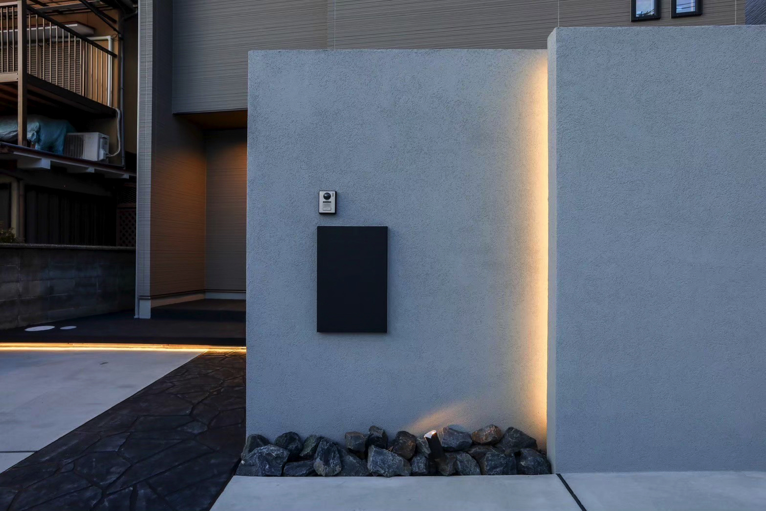 塀の高さ2.4mのグランドアートウォールを設け、外部からの視線をしっかりと遮る外構を施工しました。
