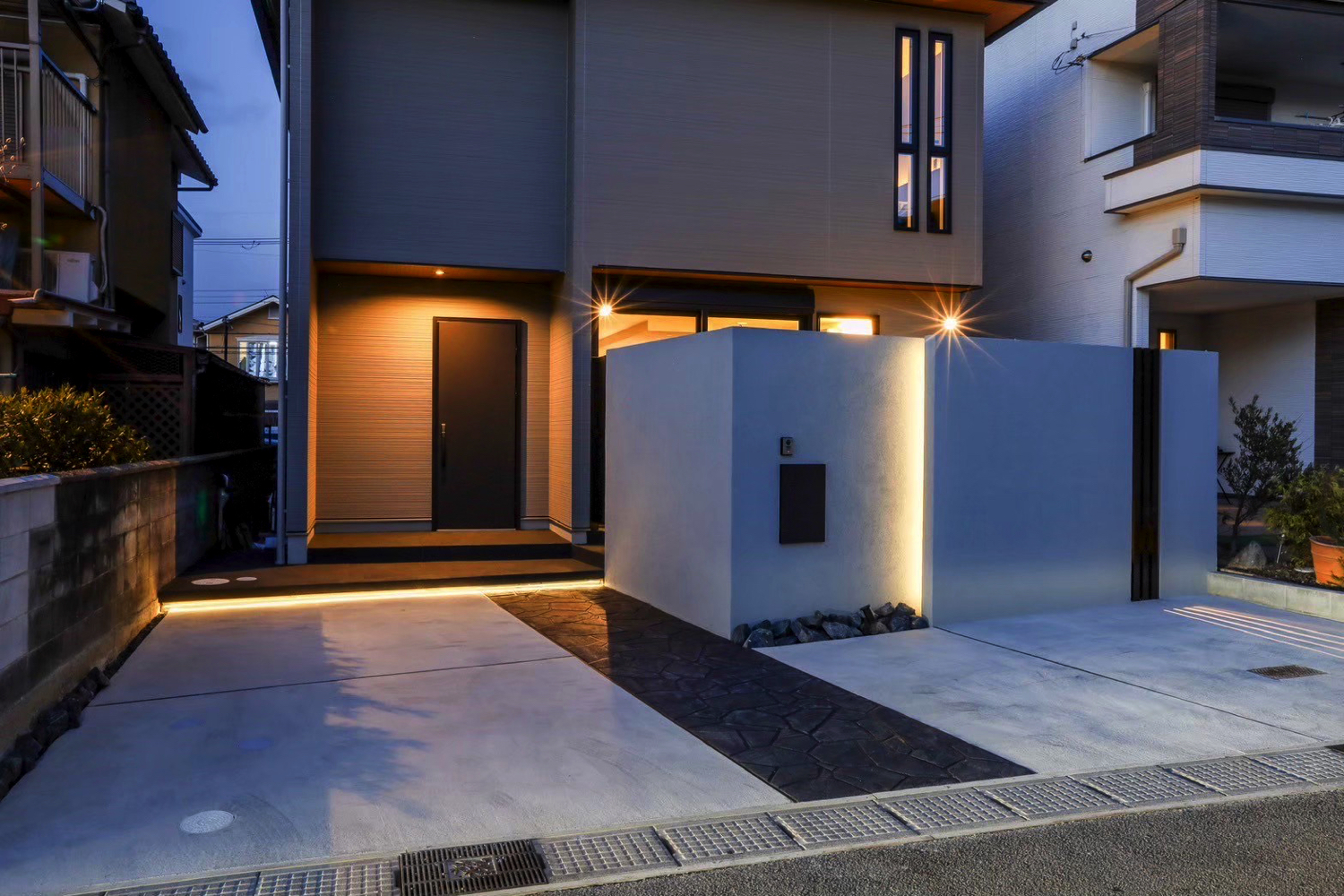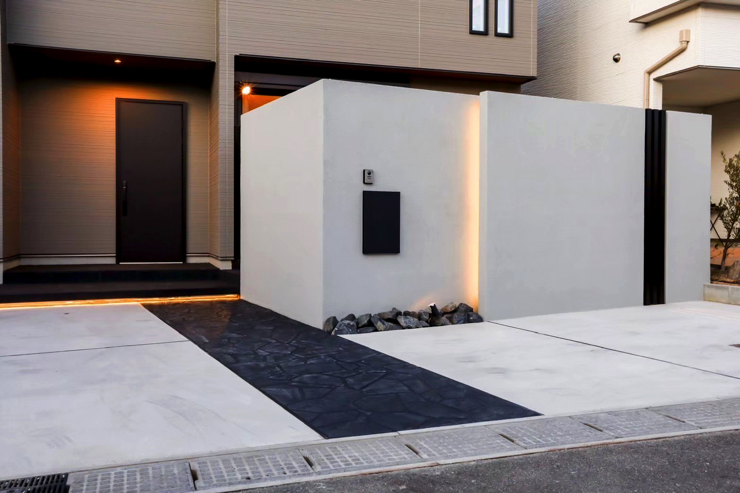 塀の高さ2.4mのグランドアートウォールを設け、外部からの視線をしっかりと遮る外構を施工しました。