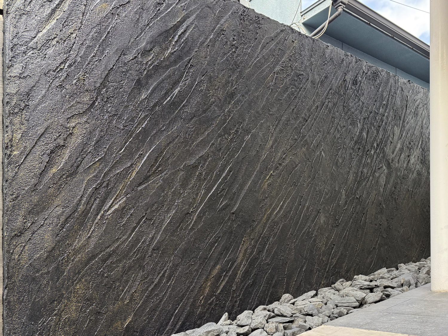 表情豊かな岩肌調の仕上がりが、外構全体に落ち着きと上質感を与えています。