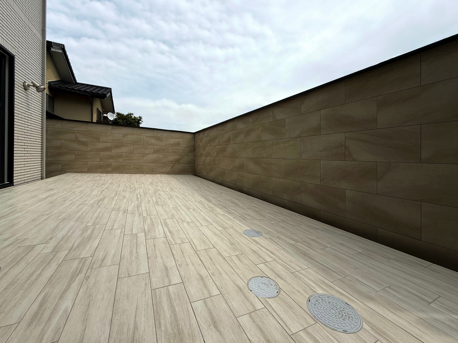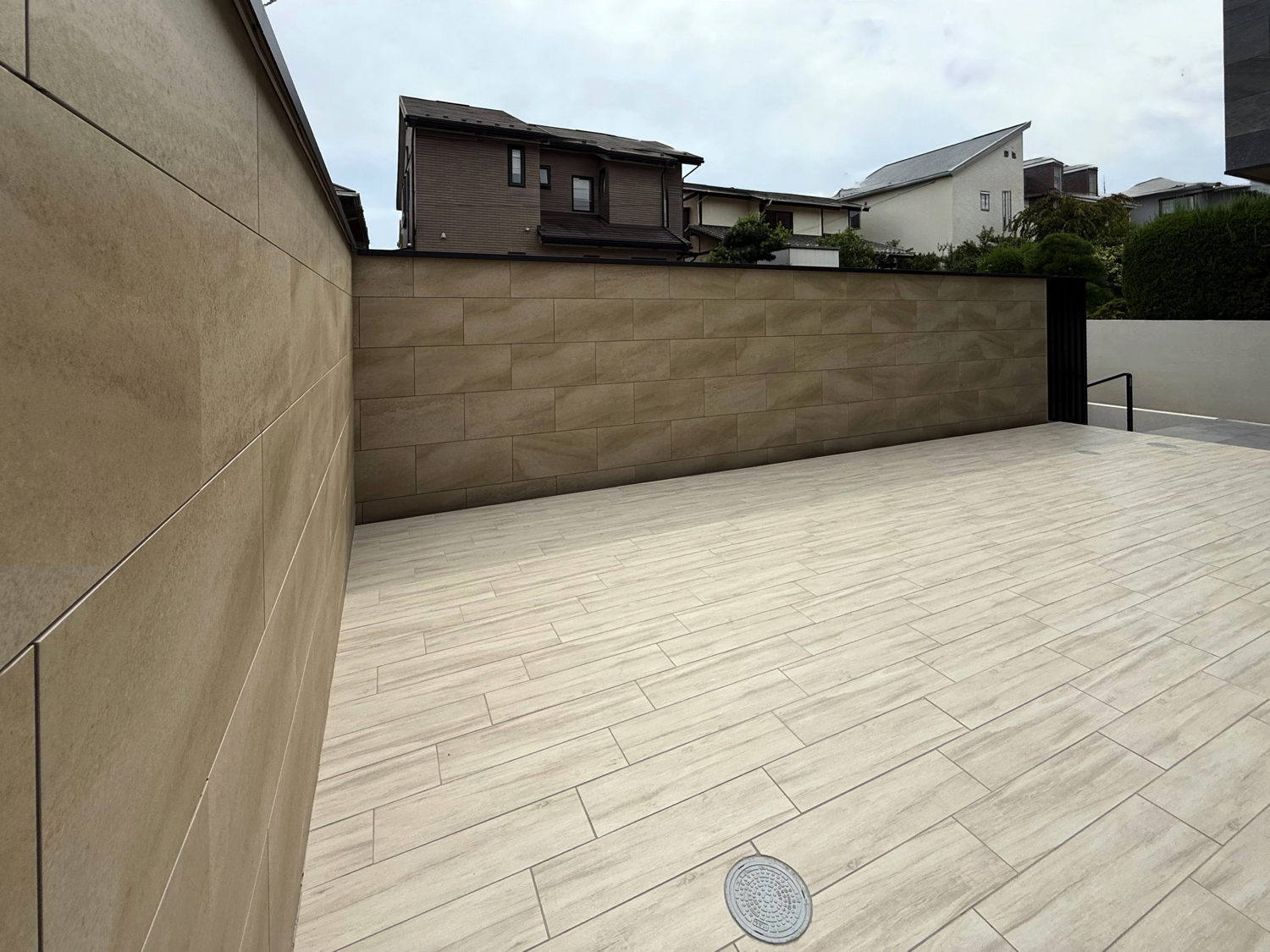 タイルデッキスペースの目隠しとして、グランドアートウォールを塀と門柱に採用いただきました。