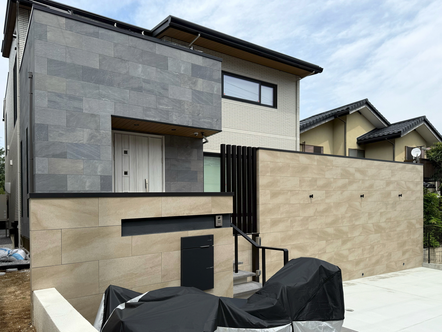 外構全体をタイル仕上げとすることで、建物との統一感を大切にした計画です。視線をしっかりと遮りながらも、重くなりすぎないバランスに配慮しています。