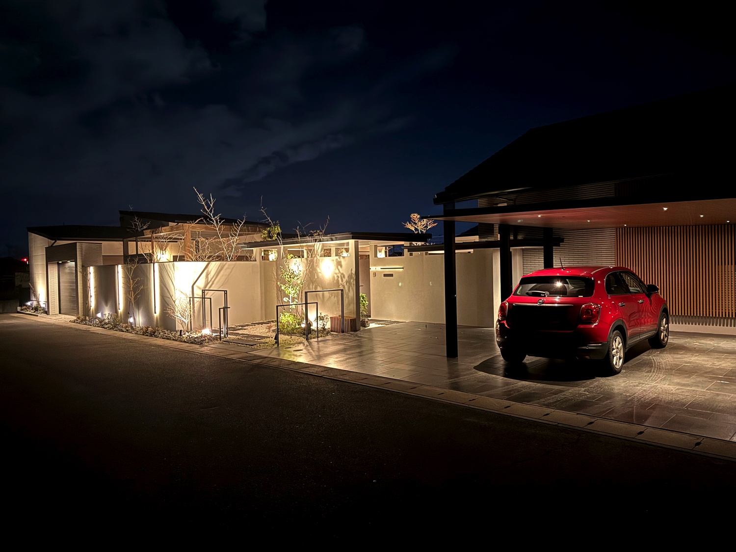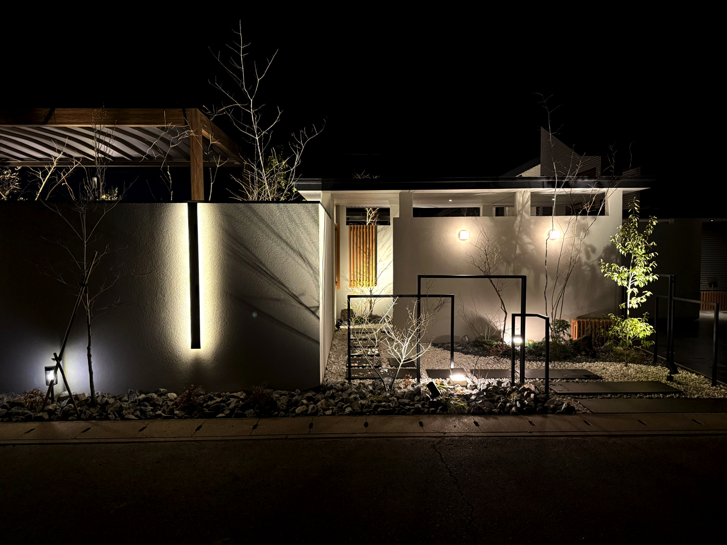 夜間はライティングによって壁面や植栽が美しく浮かび上がり、昼とは異なる表情を演出します。