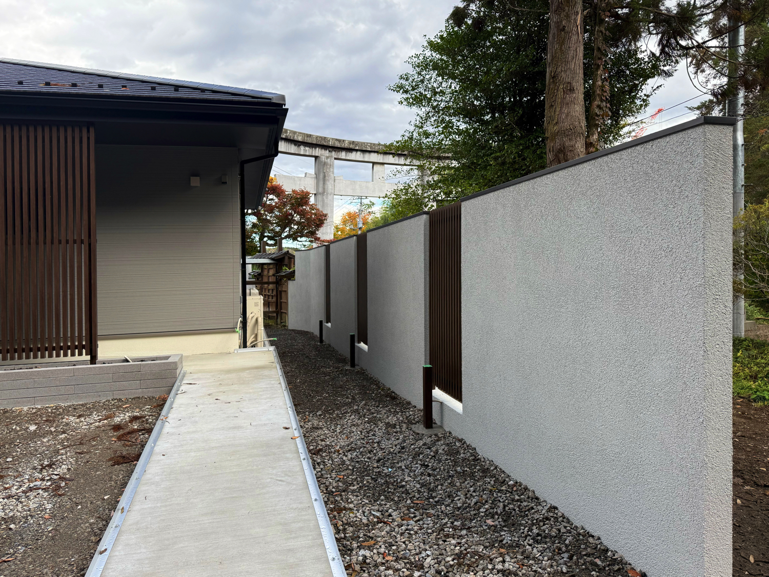 木目格子フェンスと組み合わせることで、単調にならず、建物外観とも調和した目隠し外構となりました。