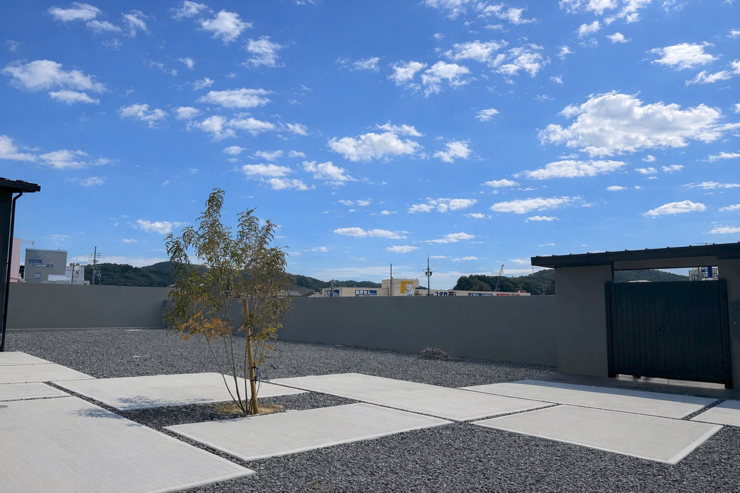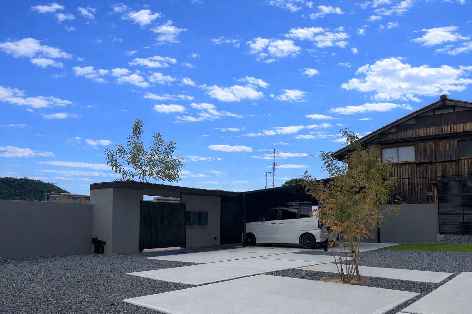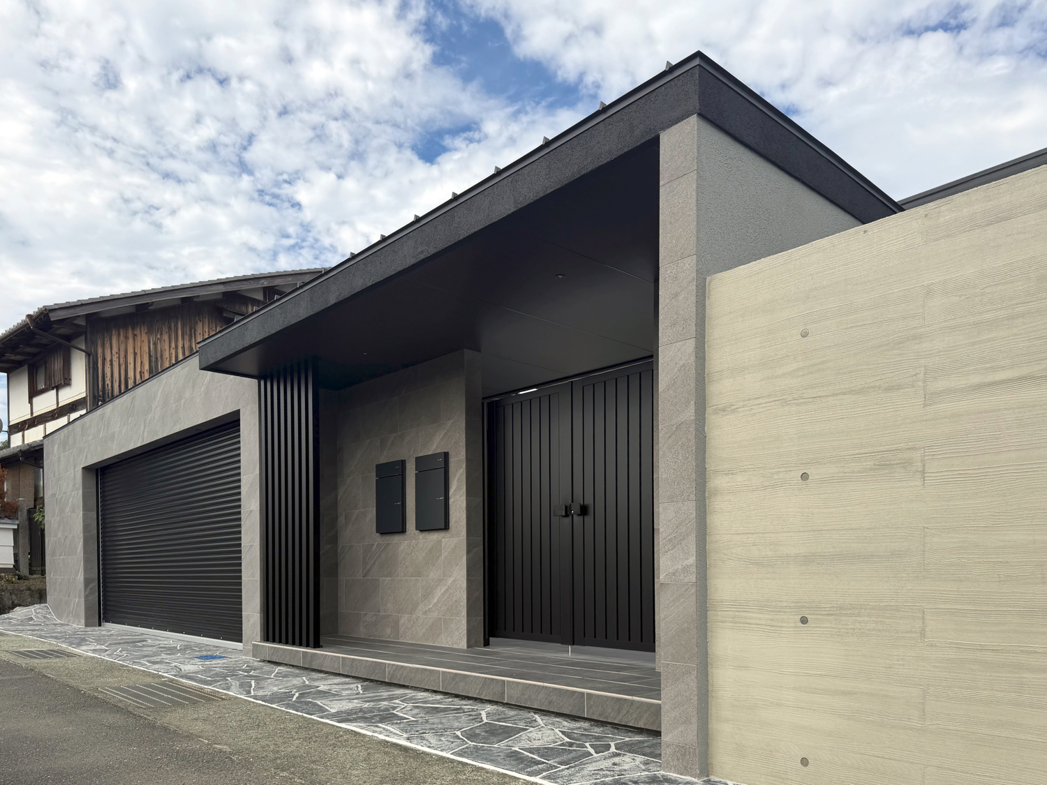 シャッターゲート開口5.4m・高さ2.2mに、文化シヤッター「モートW」特注ブラックを採用したクローズ外構を施工しました。