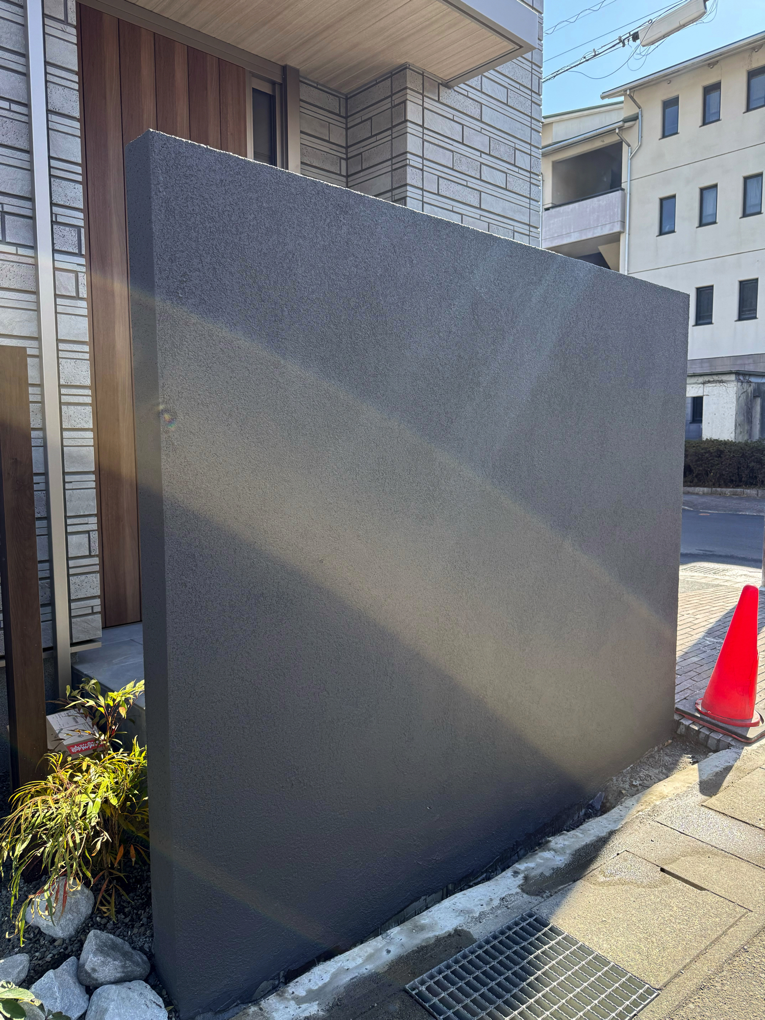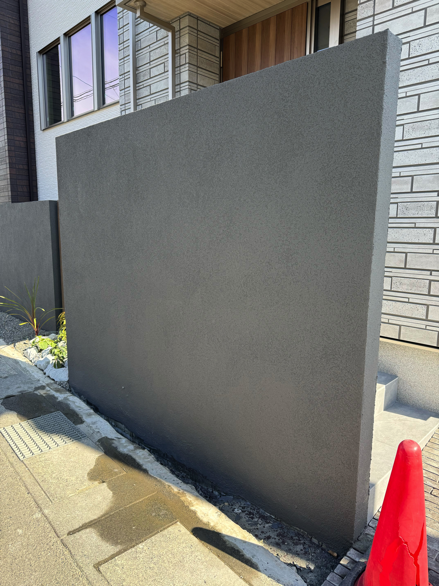 塀の高さ1.6m、長さ2.6mの門柱としてグランドアートウォールを施工いたしました。