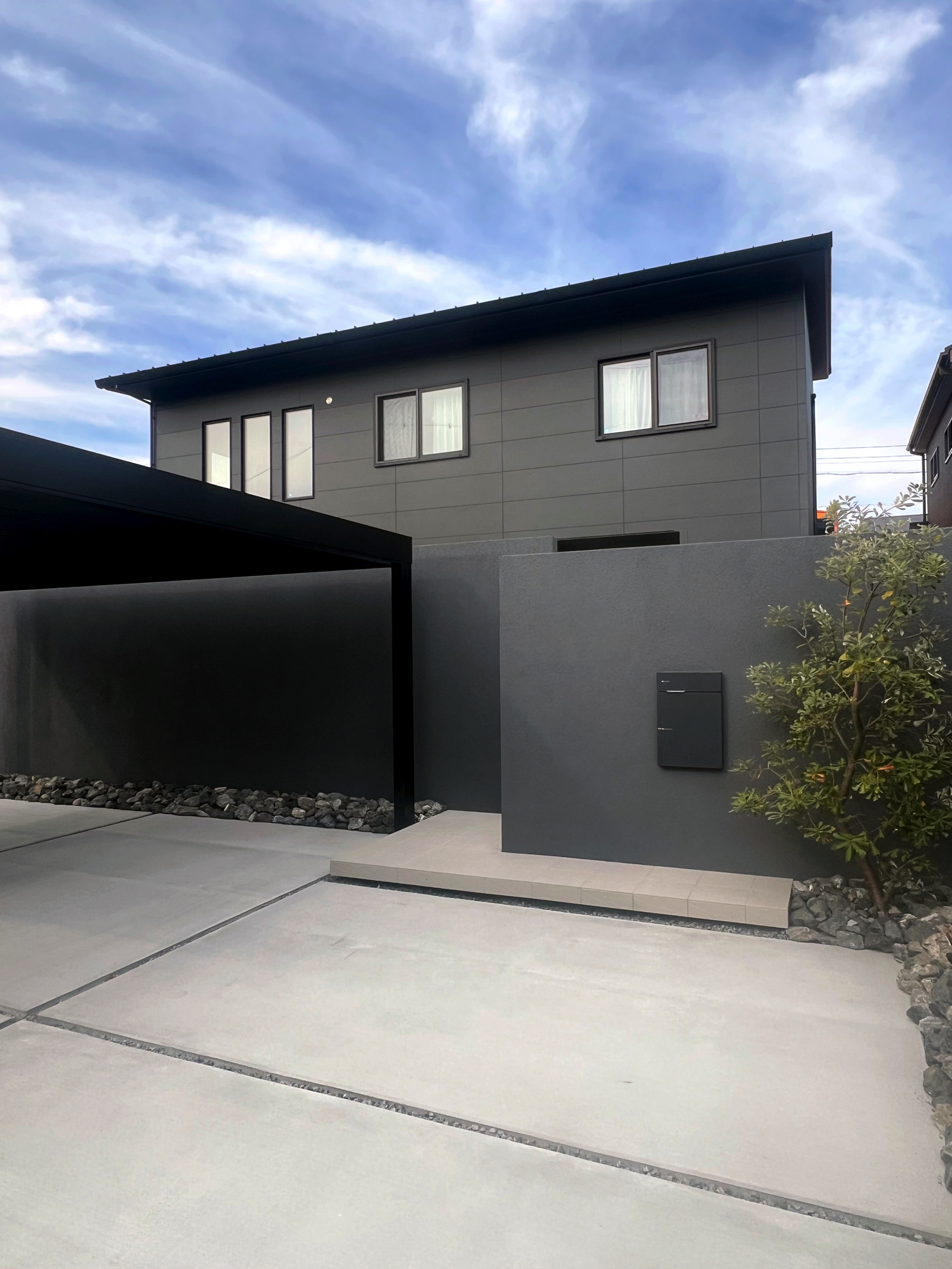 仕上げはGAWカラーG6013で統一し、建物やカーポートと調和した落ち着きのある外観に整えました。