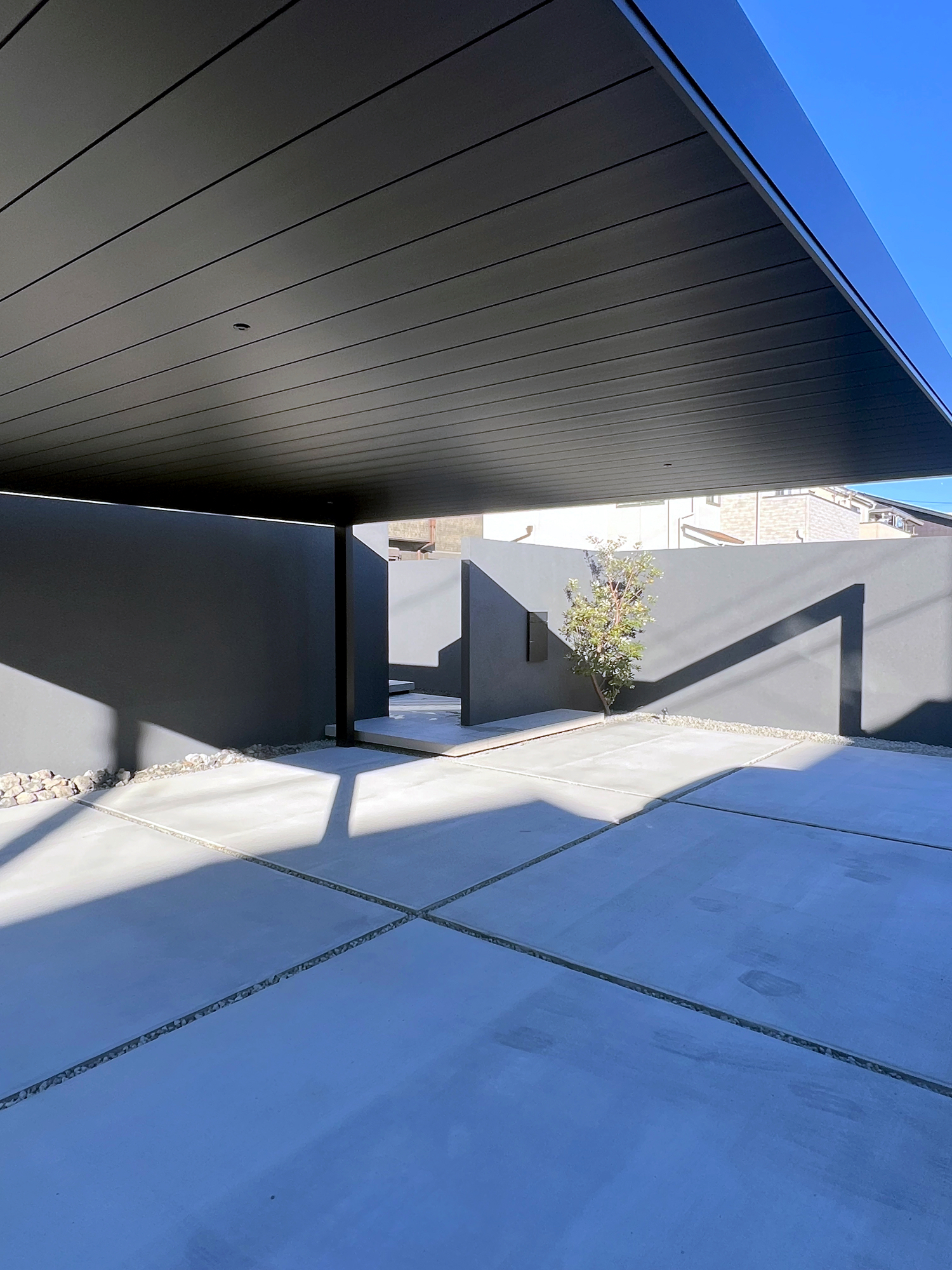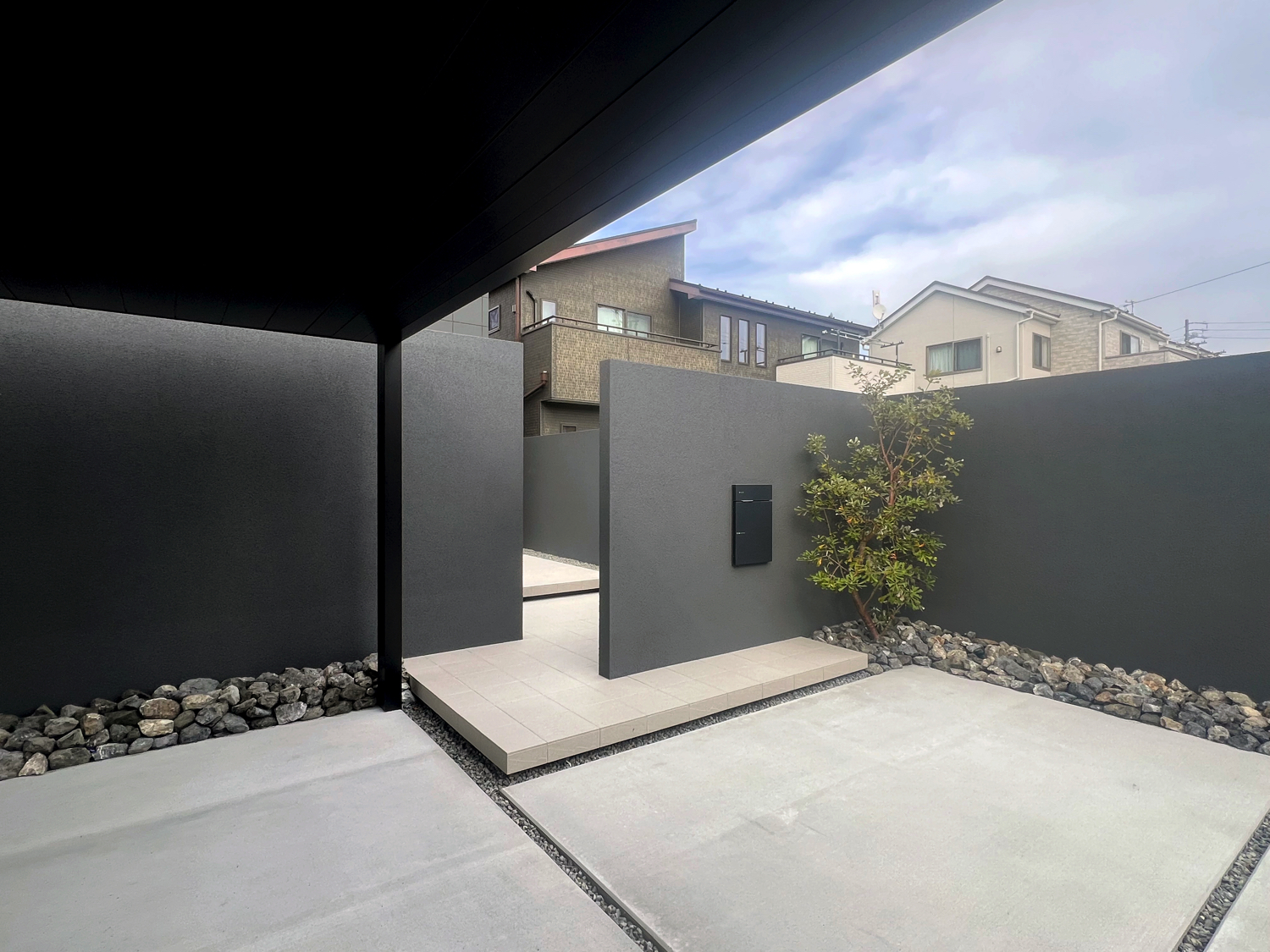 塀の高さは2.2m〜2.4mとし、隣地や玄関アプローチ、リビング前までしっかりと目隠しを確保しています。