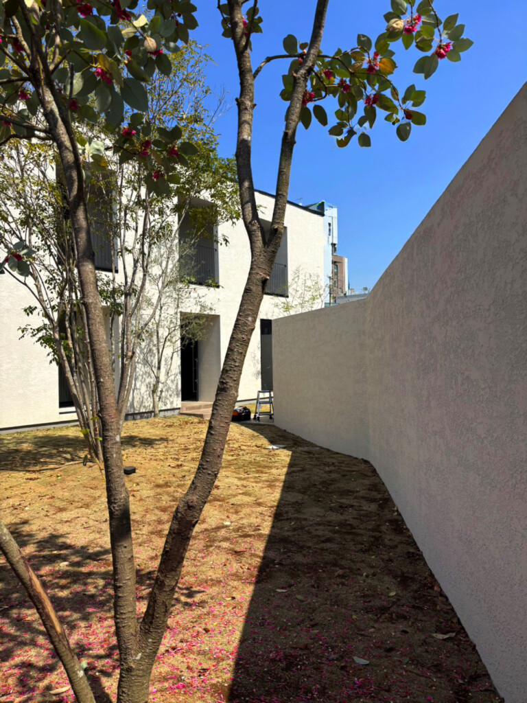 仕上げにはジョリパット「ミーティア」を採用し、建物のシンプルで洗練された外観と美しく調和する落ち着いた印象に仕上げました。